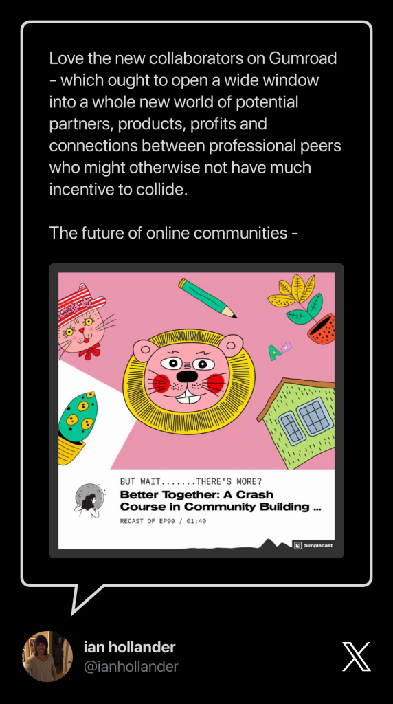 The Gumroad collaborators feature makes building a marketplace (on a bootstrap budget) exceptionally easy, elegant and affordable. (hint….zero fees for setting it up)